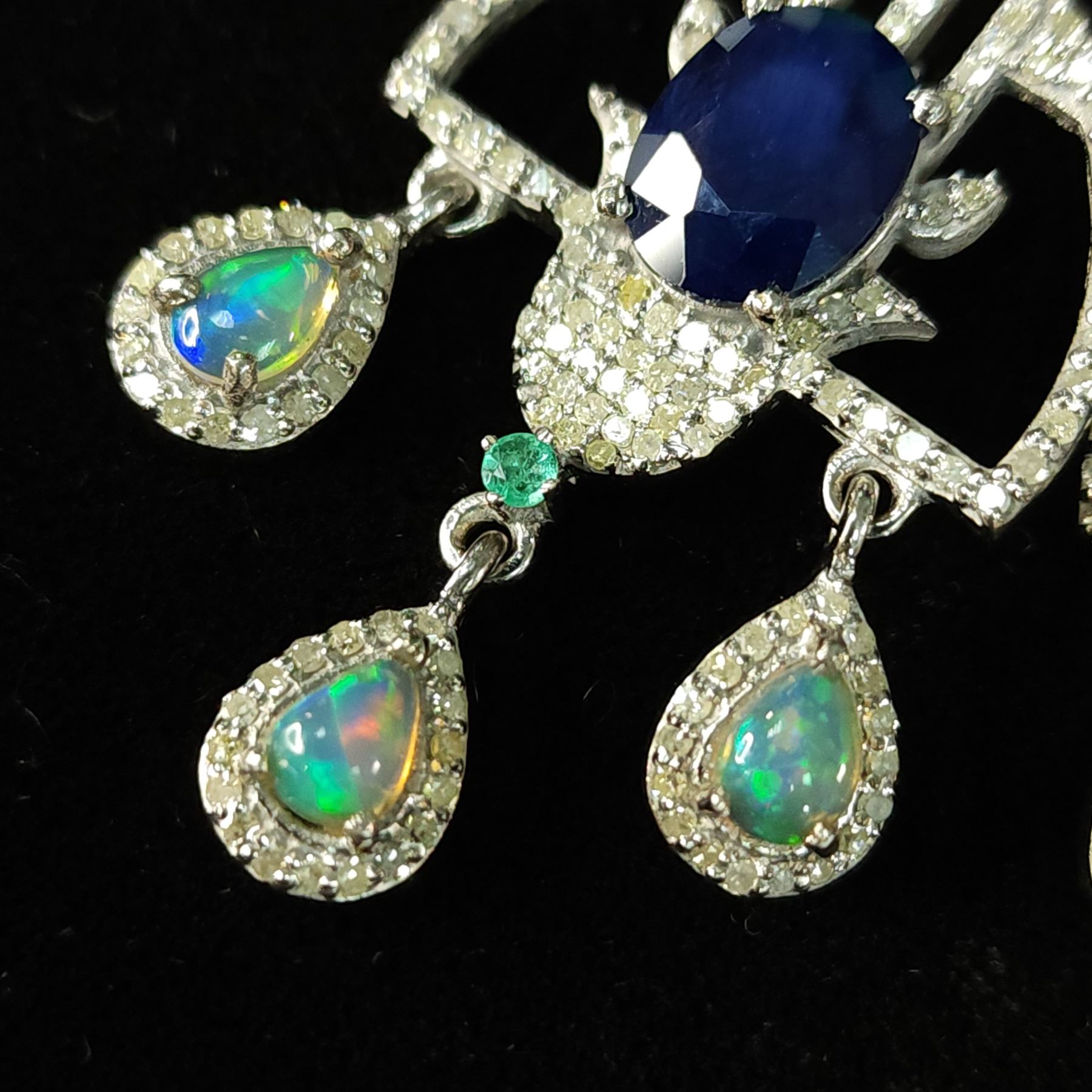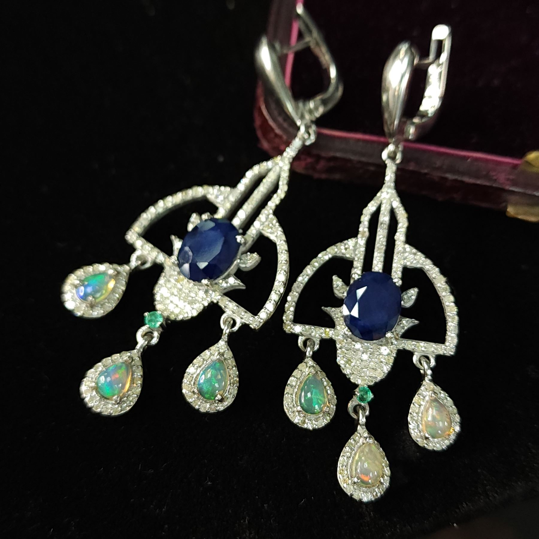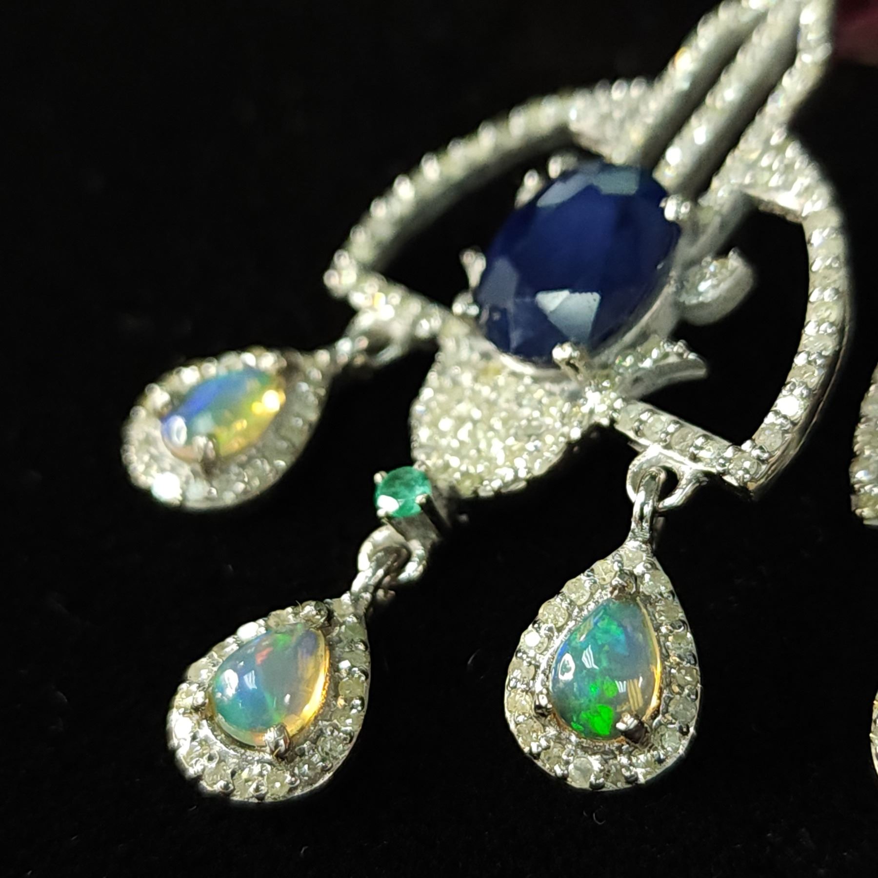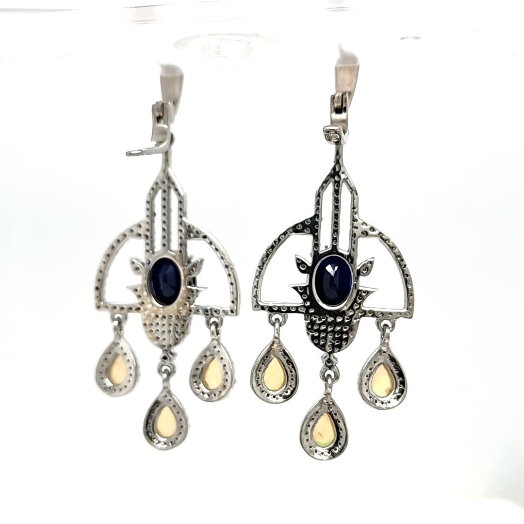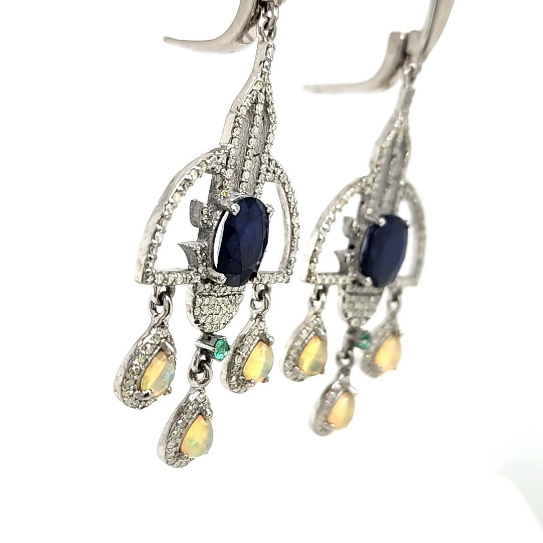 Genuine Sapphire, Genuine Emerald, Genuine Opal, and Earth-Mined Diamond Earrings.& nbsp; These earrings won't just make a statement, they'll more likely make the headlines!!!& nbsp; So very exciting, they are black rhodium coated sterling silver (.925) chandelier-style earrings with a total of 6.03 carats, oval-cut, prong-set blue sapphires (10 mm x 8 mm each).& nbsp; There is 2.10 carats of round, faceted, prong-set diamonds in the Art-Deco inspired frames.& nbsp; Each earrings has a 2.25 mm emerald& nbsp; above the 'chandelier' from which three opals dangle, for a total of 1.75 carats of pear-shaped natural opals in the pair of earrings.& nbsp; The earrings hang approximately 2.5& quot; long and are approximately 1& quot; wide.& nbsp; They attach to the earlobes with posts and lever backs.& nbsp; The earrings are well-made and sturdy.& nbsp; This is a brand new item in excellent condition.