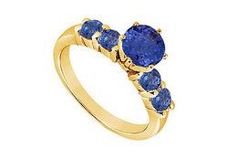 A bigger round sapphire is prong-set in the center and is flanked by two smaller round sapphires on sides. Made in 14K yellow gold this ring has a total gem weight (TGW) of 0.75 ct.
