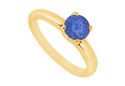 A vibrant round sapphire is prong-set in the center. This sleek gemstone solitaire ring is made in 14K yellow gold and has a total gem weight (TGW) of 1.00 ct.