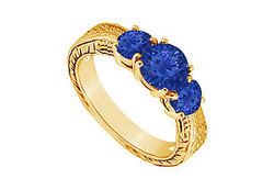 Three round cool azure sapphires are prong-set in the center of the ring. The band is intricately designed in 14K yellow gold. This three stone ring has a total weight (TGW) of 0.75 ct.