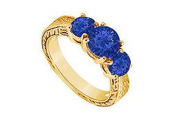 Three round  cool azure sapphires are prong-set in the center of the ring. The band is intricately designed in 14K yellow gold. This three stone ring has a total weight (TGW) of 1.25 ct.