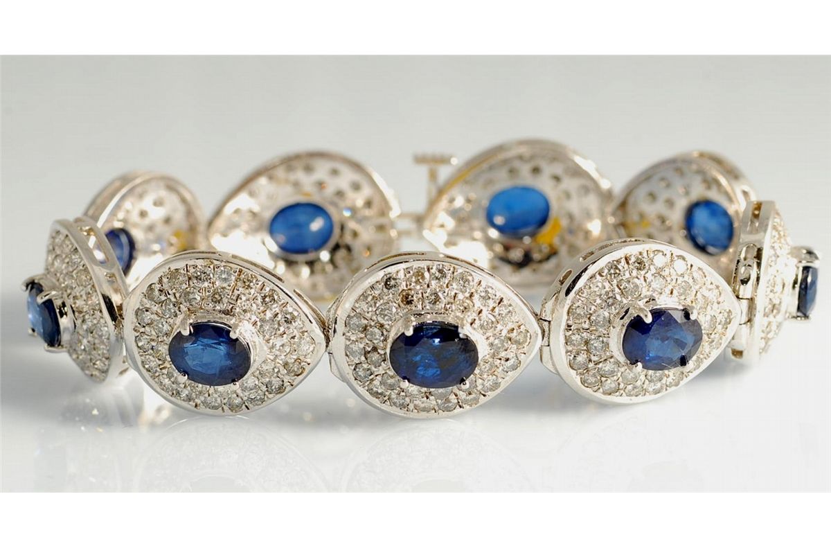 12.94 carat sapphire and 8.24 carat diamond lady's bracelet. Identified with markings of "K 14", stamped and tested 14K white gold. Measurements 7.00 inches in length and 0.60 inches wide. Box clasp with safety closure. Bright polished finish. Color of diamonds: H-I, clarity: Si1-SI3.