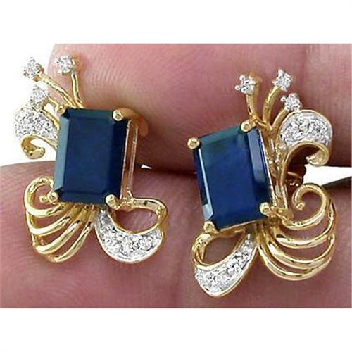A pair of emerald cut Sapphire and Diamond Earrings with 3.35cwt of fine color and clarity Sapphires with .15 cwt of accent Diamonds. The Diamonds are G in color and SI1 in clarity. The setting is 2.77 grams of 14KT yellow gold. Shipped in a gift box.