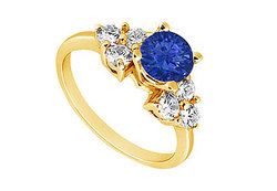 A round cool blue sapphire is prong-set in the center and is flanked by three smaller round diamonds on each side. Made in 14K yellow gold  this engagement ring has a total weight (TGW) of 0.75 ct.