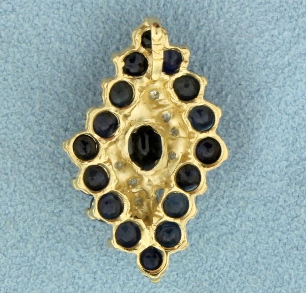 In 14k yellow gold. 1" long with bale. Center stone is a high quality 1/2ct oval shaped sapphire with deep blue color and sixteen round .1ct sapphires of similar high quality. Also contains ten round high quality .005ct diamonds. 3.0g.