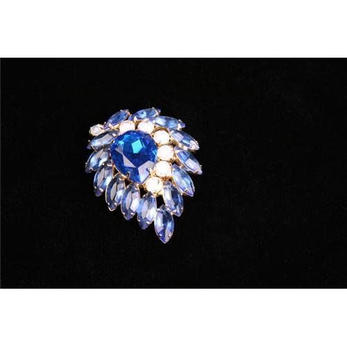 A central large sapphire tear drop rhinestone half surrounded with diamond princess cut rhinestones all outlined with sapphire princess cut rhinestones to form a tear drop brooch. Length: 2 1/2", Width: 1 3/4".