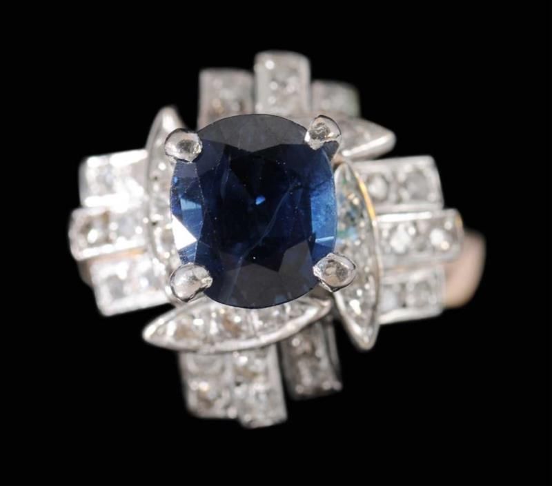 Sapphire and Diamond Ring central oval faceted blue sapphire, estimated weight 3.0 cts., accented with 36 diamonds, total estimated weight .36 cts., 18 kt. yellow gold mount, size 6; insurance replacement value $9,675, with appraisal (MWF