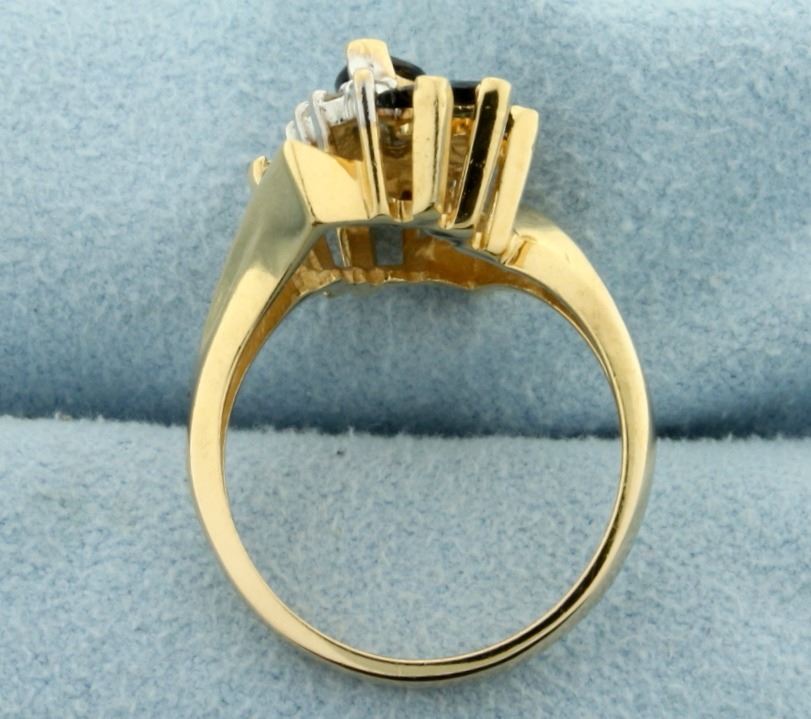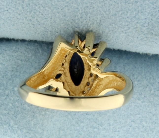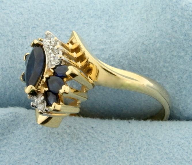 In 14k yellow gold. Contains a natural 8x4mm marquise cut sapphire along with two 4x2mm and four 3x2mm marquise sapphires, all with vivid deep blue color and excellent clarity. Also contains eight high quality .01ct round diamonds, SI clarity/G color. Size 7. 5.0g.