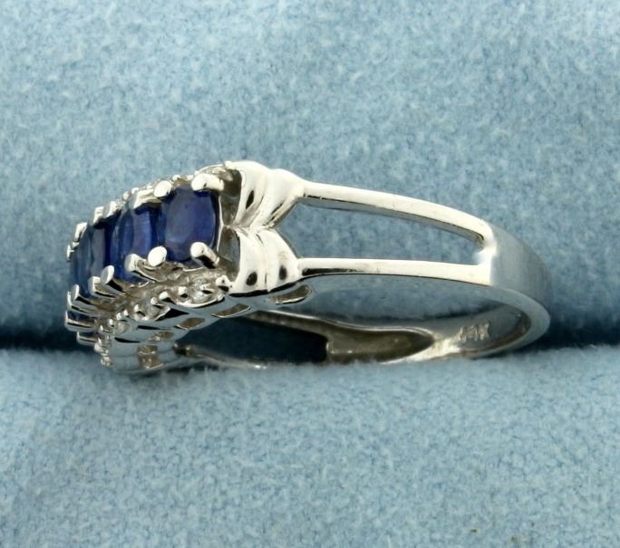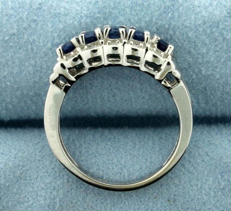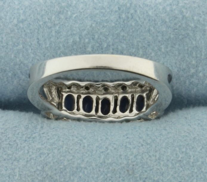 In 14k white gold. Contains five high quality natural 5 x 3mm oval cut sapphire gemstones with vibrant blue color and excellent clarity. Also contains ten high quality 1/2pt diamonds. Size 7. 4.4g.