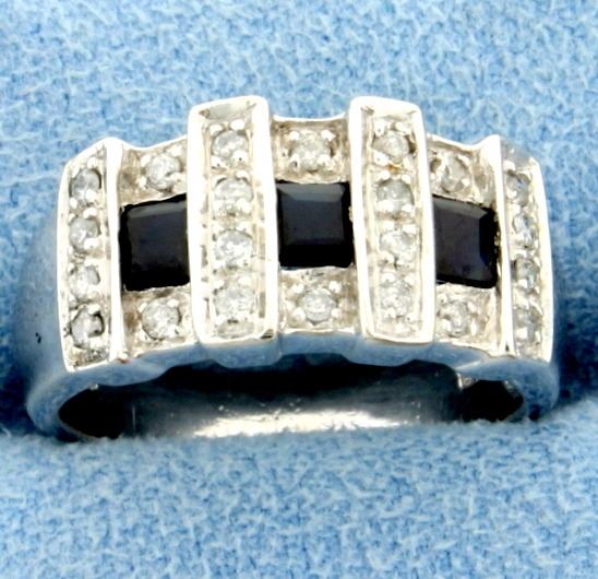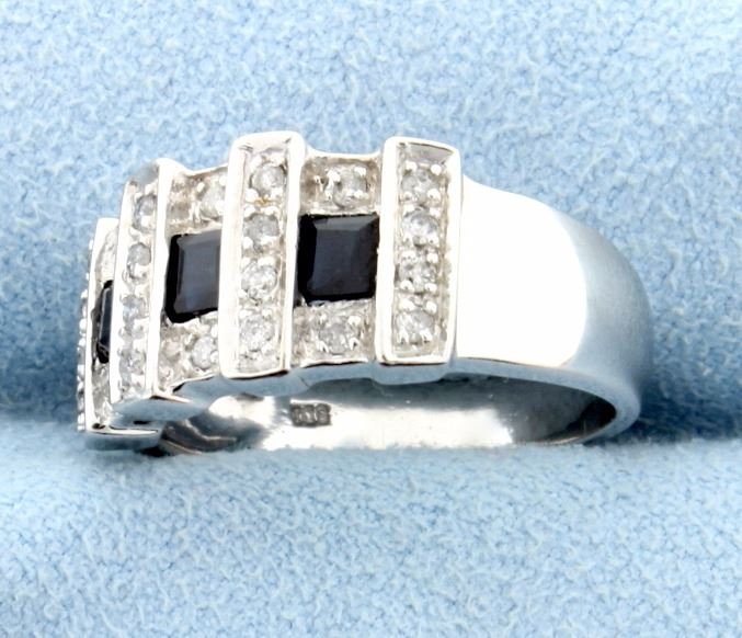 In 14K white gold. Contains 1/4ct TW of high quality round brilliant diamonds, SI clarity/H color. Also contains three high quality 3x3mm square sapphires with a deep blue color. Size 6 5.6g