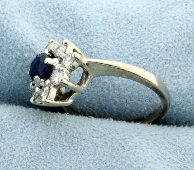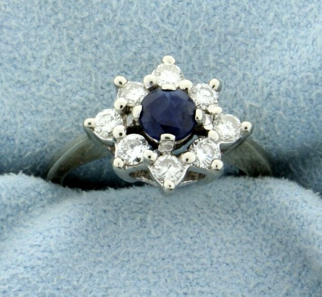 14K white gold this ring contains 1/2ct high quality natural sapphire with great blue color and clarity. Also it contains eight .05ct diamonds that are high quality- VS clarity/H color. Size 5 1/4 3.4g