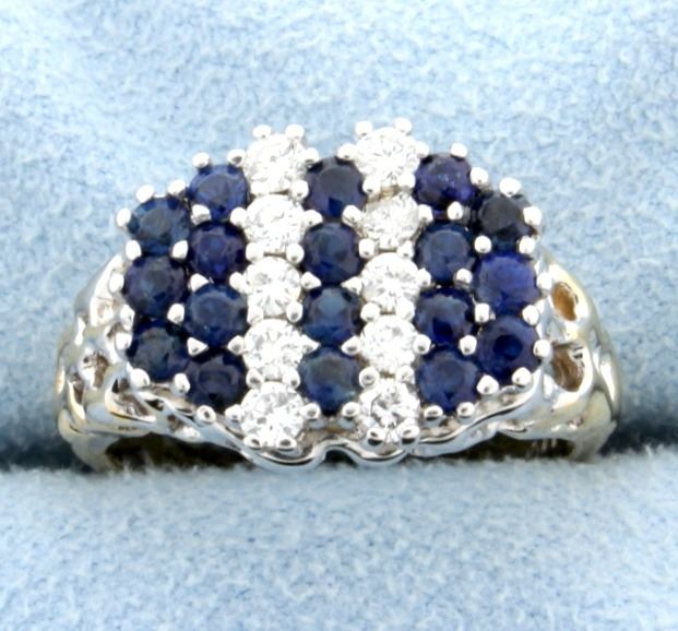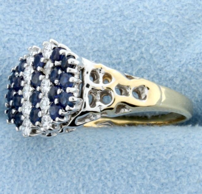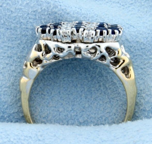 White and yellow 14k gold sapphire and diamond ring. Contains ten, .05 ct diamonds .5ct TW. Eighteen 2mm sapphires, approximately .6ct TW. Size 6.5. 5.6g.
