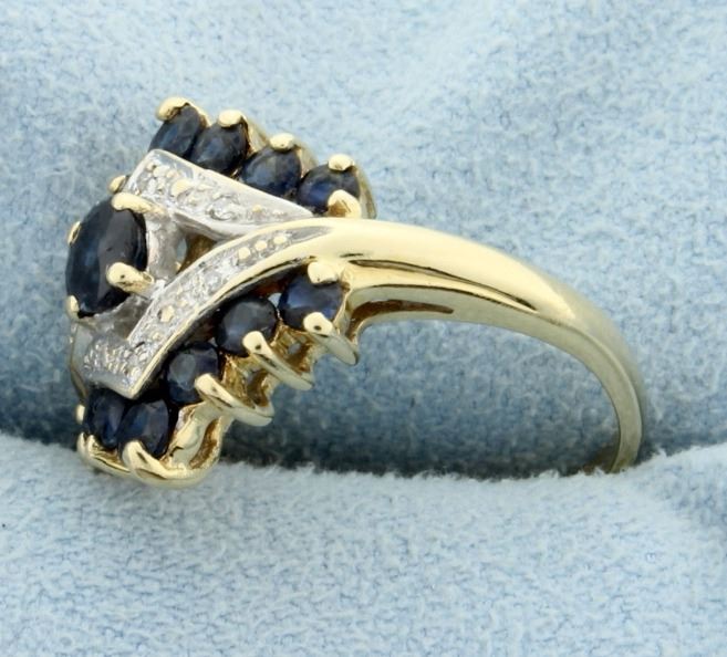 In 14K yellow gold, this ring contains over 1 ct TW of natural sapphires and six 1/2 pt diamonds. The ring is a size 6 3/4. 4.0g