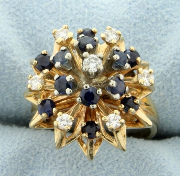In 14K yellow gold, it contains seven .05ct high quality diamonds, VS clarity/G color. Also contains twelve 2.5mm sapphires with excellent color and clarity. Size 5 3/4 8.7g