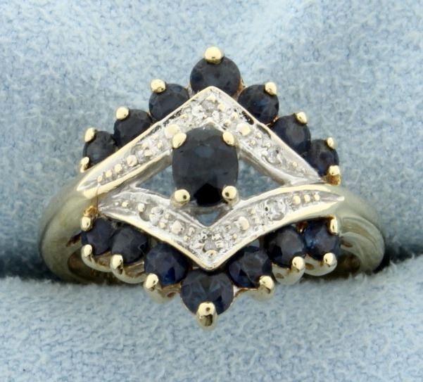 In 14K yellow gold, this ring contains over 1 ct TW of natural sapphires and six 1/2 pt diamonds. The ring is a size 6 3/4. 4.0g