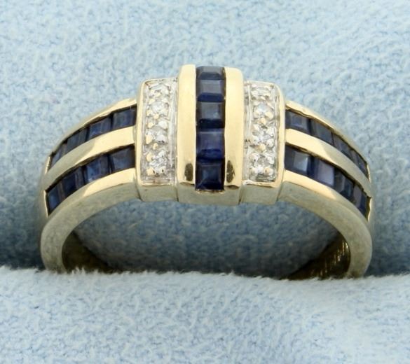 In 14K yellow gold, this ring contains twenty one 1.6mm square sapphire gemstones with deep blue color and great clarity. Also contains eight 1/2pt diamonds. Size 7     3.7g