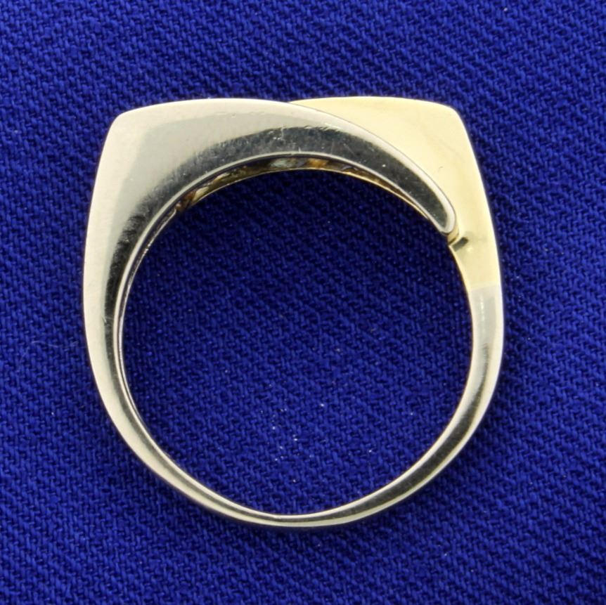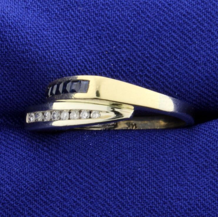 In 14k yellow gold this ring contains eight square natural sapphires ranging from 1mm to 3mm in length. Also has .15ct TW of high quality round diamonds SI clarity/H color. Size 7 1/2 4.1g