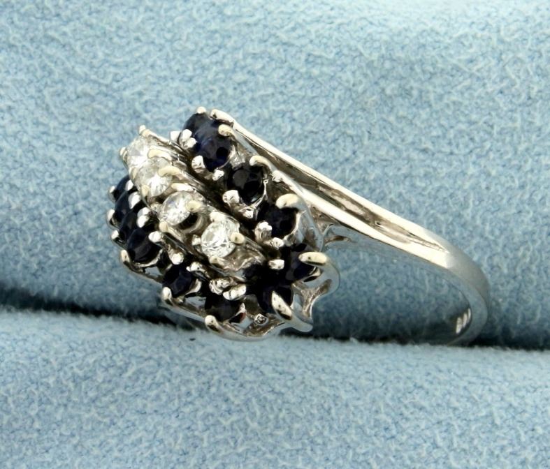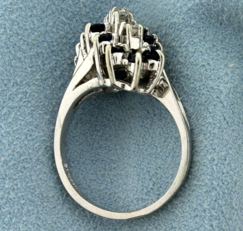 In 14k white gold, containing five high quality .05ct diamonds (SI clarity/G color) surrounded by fourteen 2mm sapphires with deep blue color. Size 5 1/2. 4.8g.