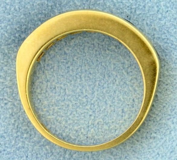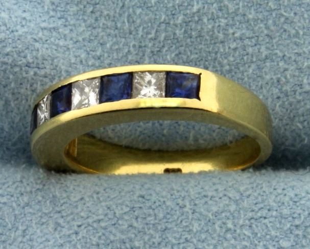 In 18k yellow gold. Contains five 2mm square cut high quality natural sapphires with bright blue color and excellent clarity. Also contains four 2mm high quality square cut diamonds, H color, SI clarity. Gemstones are channel set in alternating pattern. Size 4. 4.0g