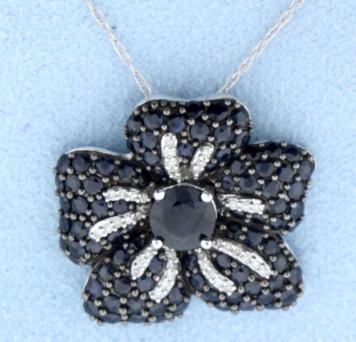 Stunning 14k white gold pendant that sparkles with deep blue sapphires and accented with 0.12 carats of diamonds and a 14k white gold chain. 6.2g