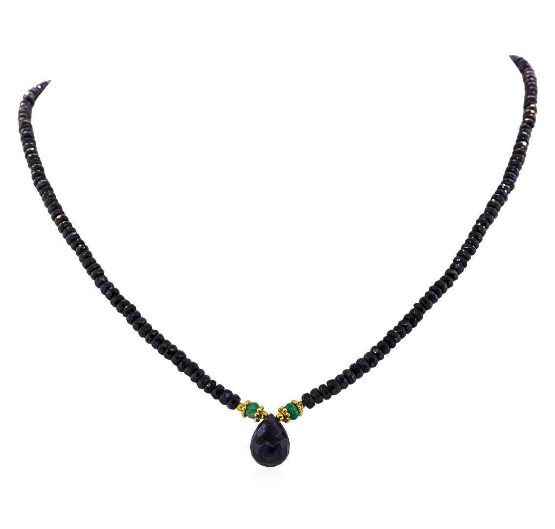 One necklace weighing 15.3gm containing sapphire and emerald measuring 18 inches with silver spring ring clasp.