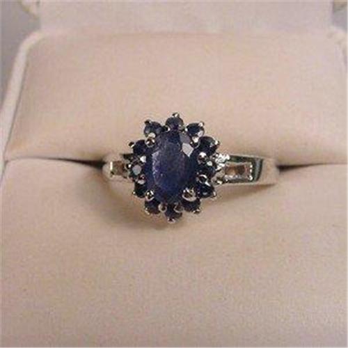 New cluster ring - raised central oval sapphire, surrounded by lower oval of 12 small sapphires. Mounted in sterling silver, with cut-work oblong on shoulders. Face of ring measures 11 mm by 10 mm (11/16 inch by 3/8 inches). Ring size is English P+ (USA size 7.3/4 inches). Very pretty ring.