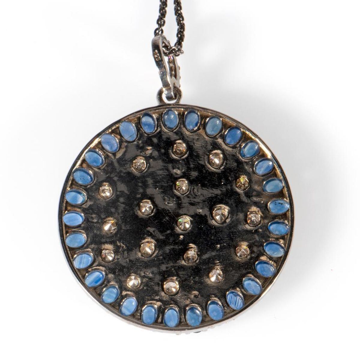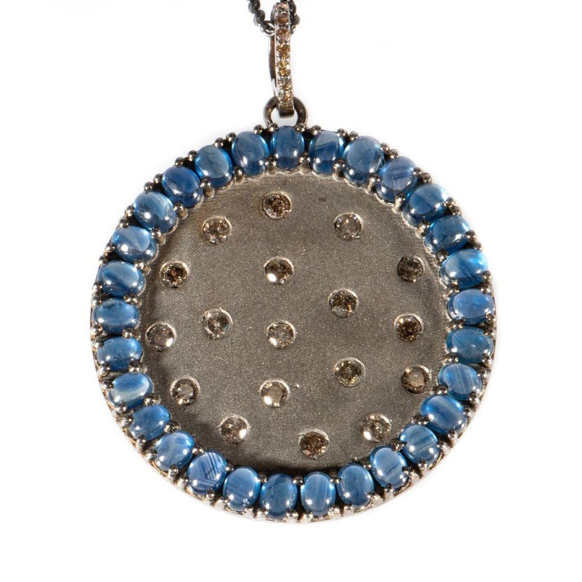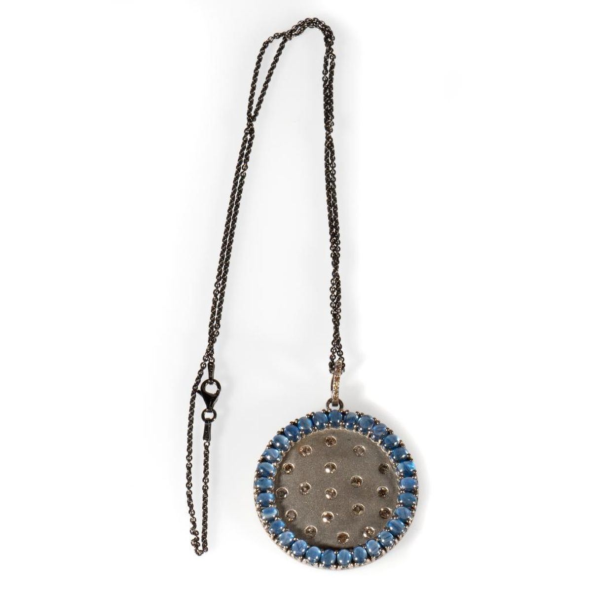 the matte round pendant designed with 18 flush-set round brilliant-cut diamonds, an outer frame of oval-shaped sapphire cabochons, with a diamond-set bail; estimated total diamond weight: 0.75ct; length: 17in.; pendant length: 1 3/4in.