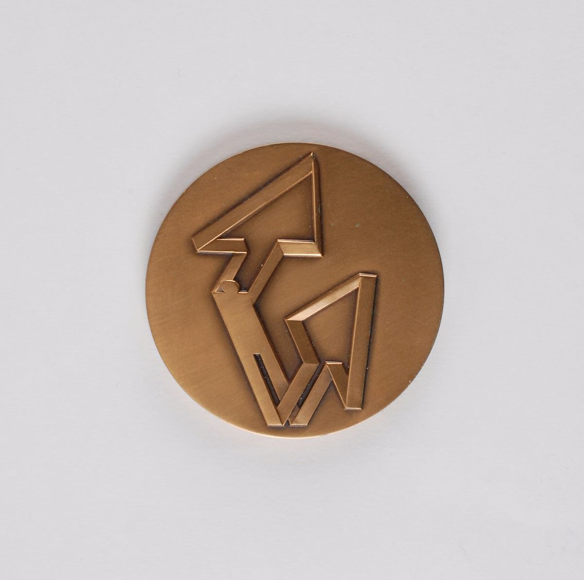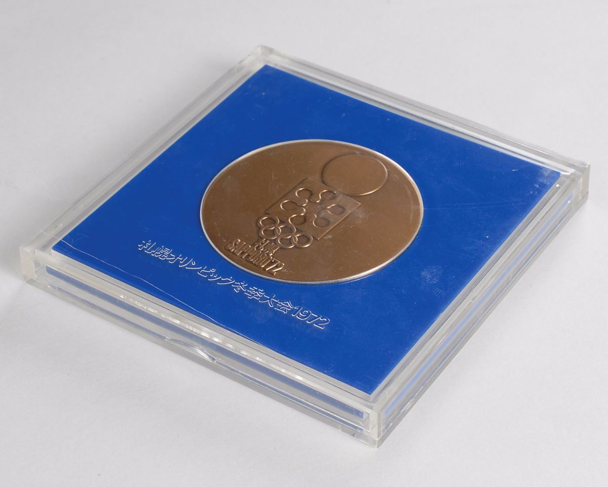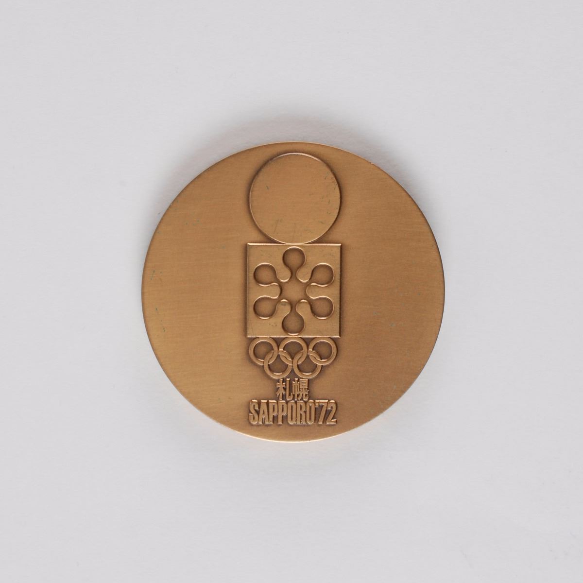Participation medal issued for the Sapporo 1972 Winter Olympics. Bronze, 60 mm, 136 gm, by Shigeo Fukuda. The front depicts the Sapporo Olympic emblem; the reverse features a stylized athlete with arrows on his arms and legs. Complete with its clear plastic case.