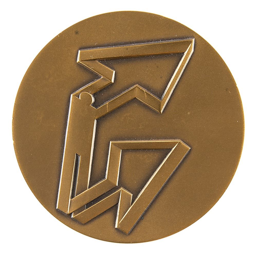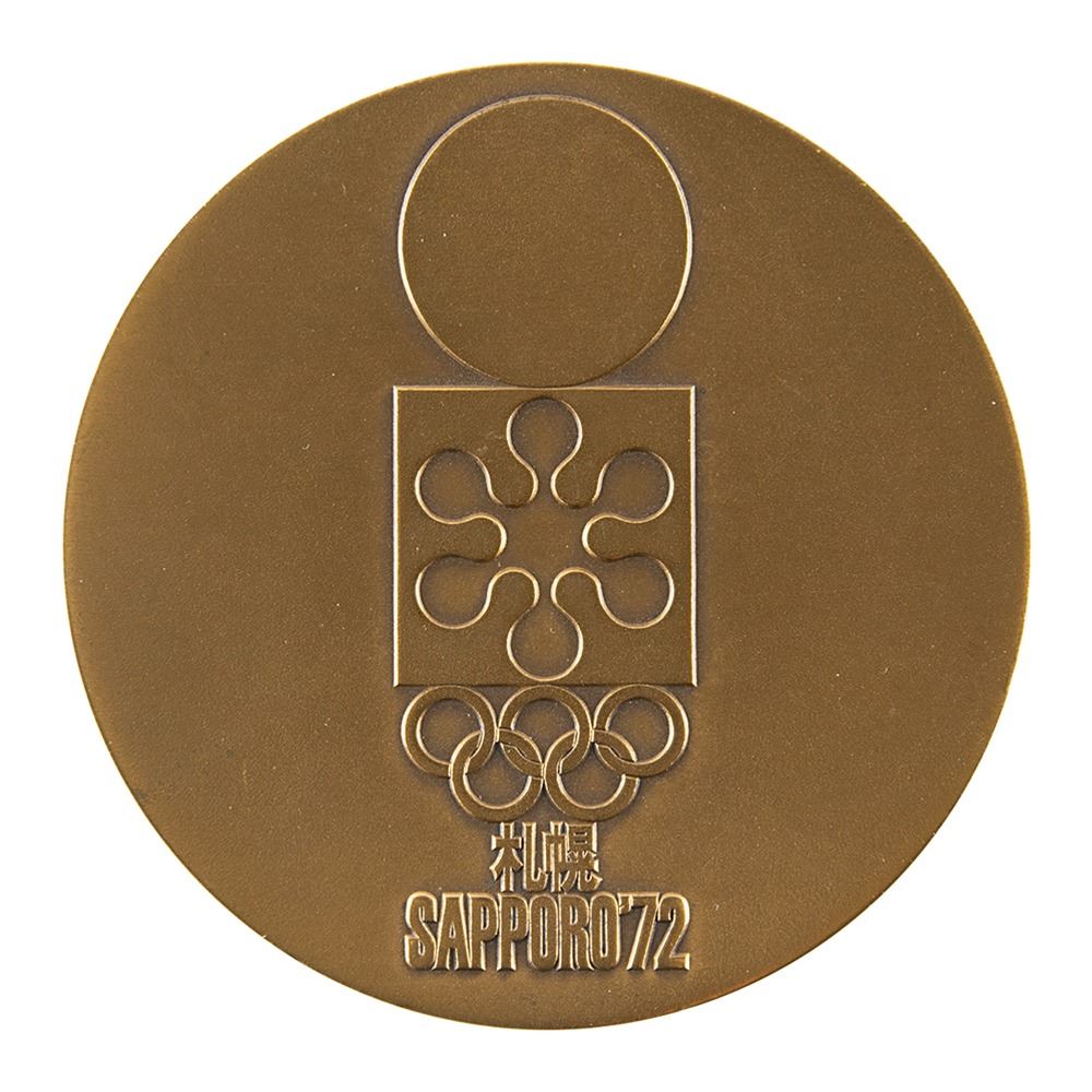 Participation medal issued for the Sapporo 1972 Winter Olympics. Bronze, 60 mm, 136 gm, by Shigeo Fukuda. The front depicts the Sapporo Olympic emblem; the reverse features a stylized athlete with arrows on his arms and legs. Some light spotting to reverse. A handsome and understated Olympic medal.