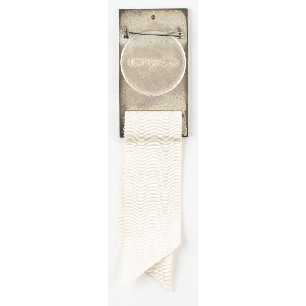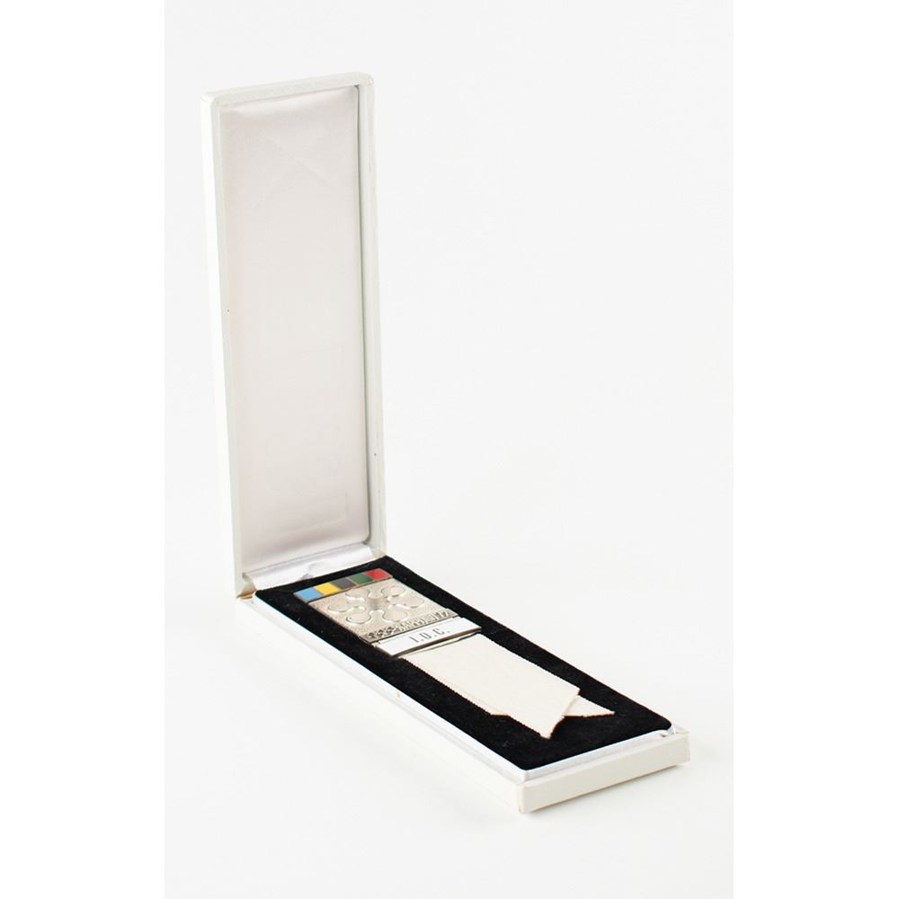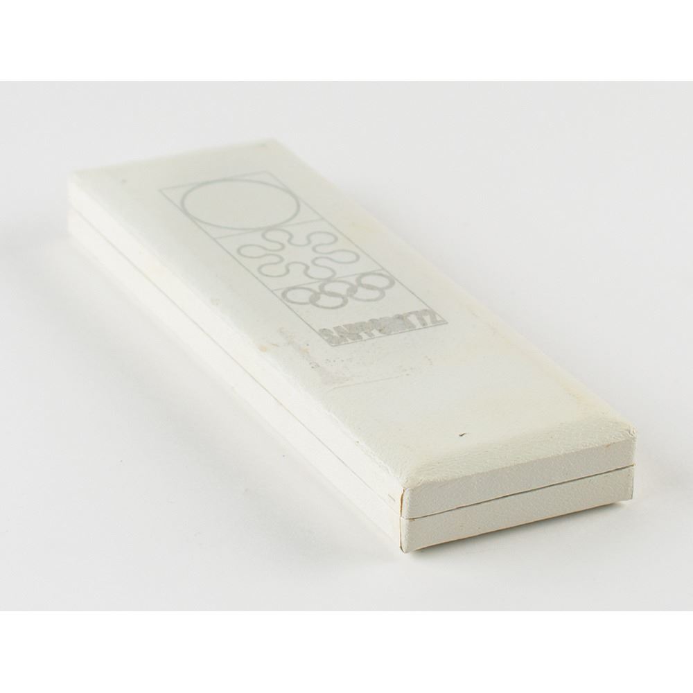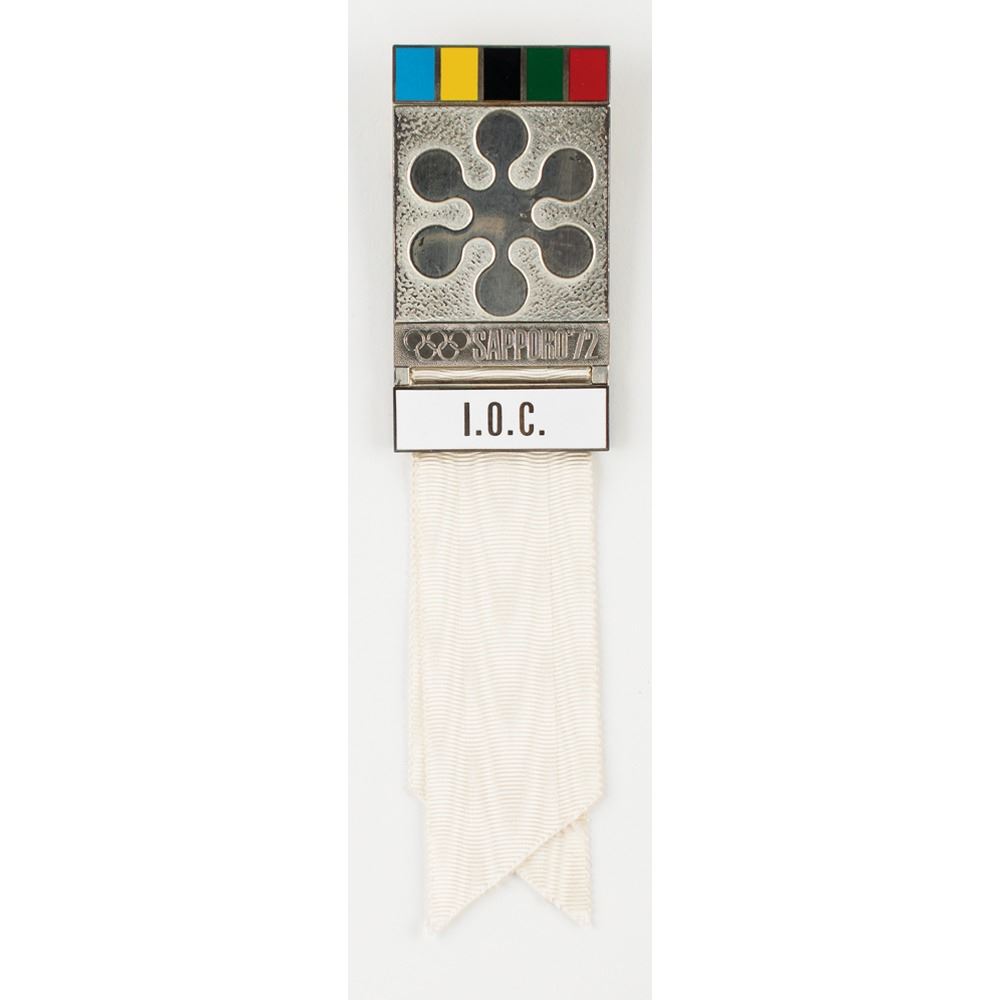 Desirable International Olympic Committee badge issued for the Sapporo 1972 Winter Olympics. Silvered bronze, 37 mm x 69 mm, with the white moiré double ribbon measuring 83 mm in length. The badge features the Olympic colors in enamel at the top, the Sapporo Games logo above Olympic rings and the text, “Sapporo ’72,†and a white enamel bar reading, "I.O.C.†Complete with its original white leather presentation box.