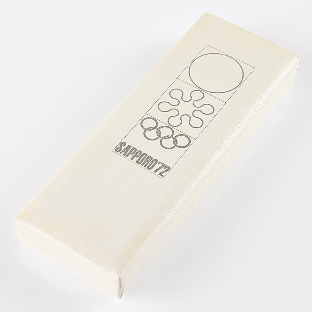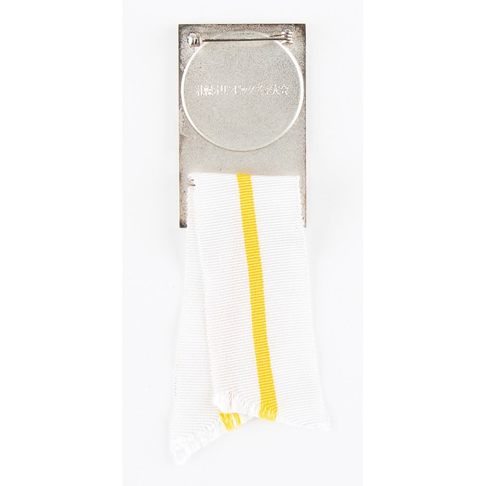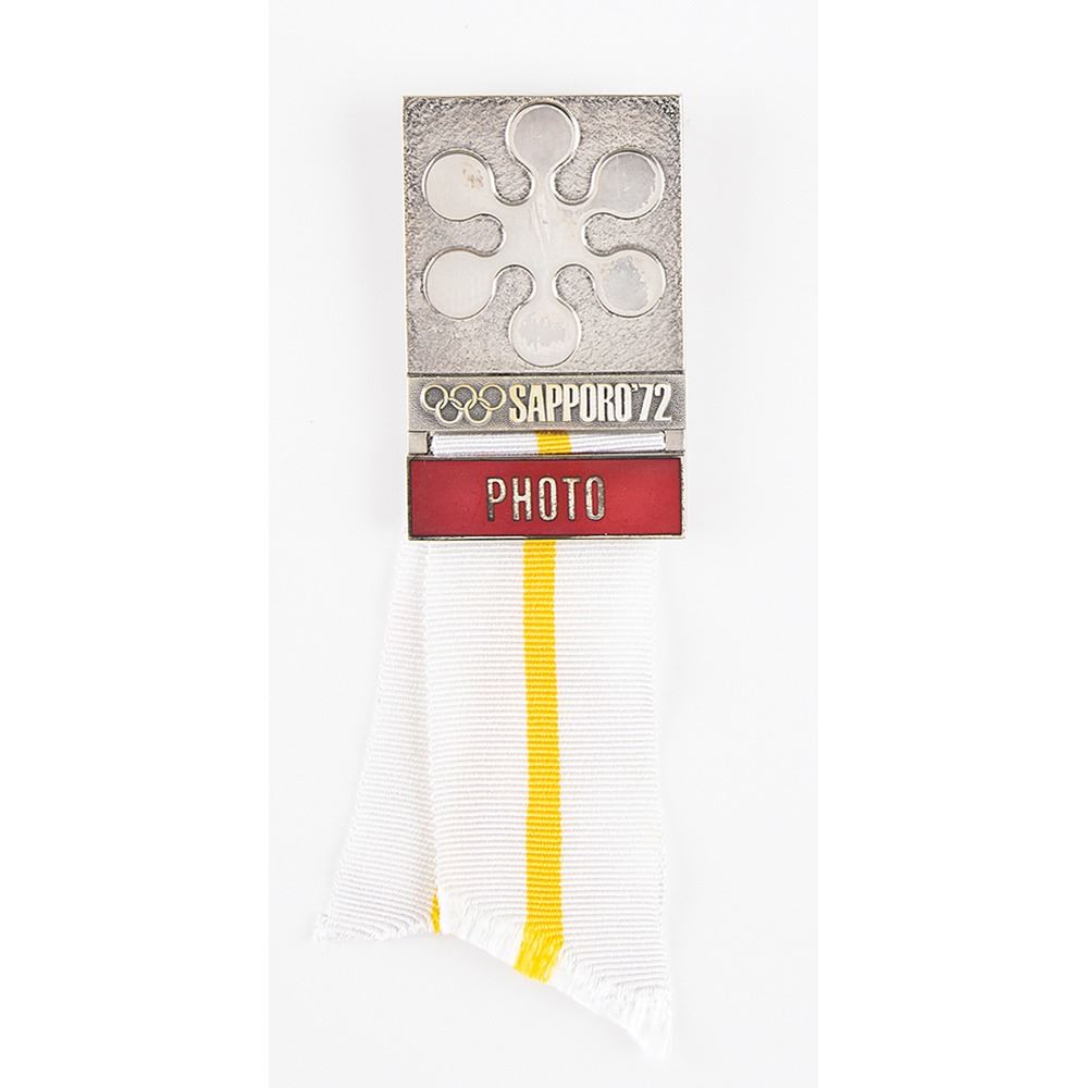 Scarce photographer's badge issued for the Sapporo 1972 Winter Olympics. Silvered bronze, 38 mm x 58 mm, 43 gm, featuring the Sapporo Games logo above Olympic rings and the text, “Sapporo ‘72,†and a red enamel bar with gilt text, “Photo.†Badge features a white ribbon with a yellow stripe measuring 85 mm in length. Reverse features a pin and raised Japanese text, "Tokyo Olympic Games." Includes the original white leather presentation case.