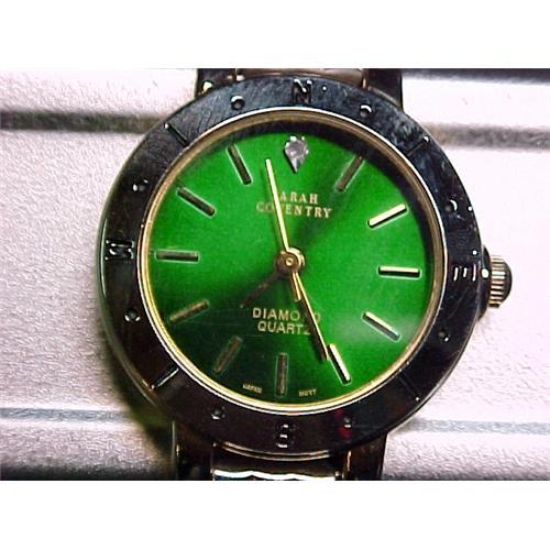 Rare and unusual find here, Sarah Coventry watch. It has a stone at the 12:00. Lovely shade of green for the dial that sits in a good size silver tone bezel. The bezel has compass markings on it. Then the stainless steel band has an adjustable clasp. <p> the case measure 2 cm in diameter <p> Japan Movement<p> sweeping second hand <p> base metal with a stainless steel back. <p>It has a brand new working battery. It is excellent working condition High fashion with function. <p> <P> You will find my selection not only interesting & fun to browse through but very affordable too. </P> <P>Please email me if you have any questions. I am always eager to assist . </P> <P>I offer a short term LAY-A-WAY on certain fixed priced items.</P> <P> </P> <P>You will want to bookmark me! </P> <P>Combine purchases and save money on shipping. </P> <P>SERENDIPITY ON LINE ANTIQUE SALES </P>
