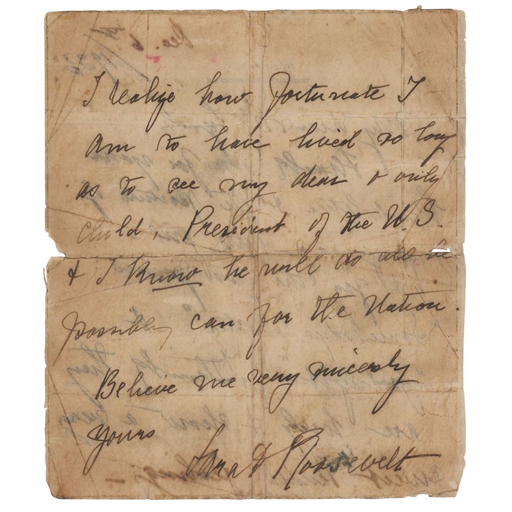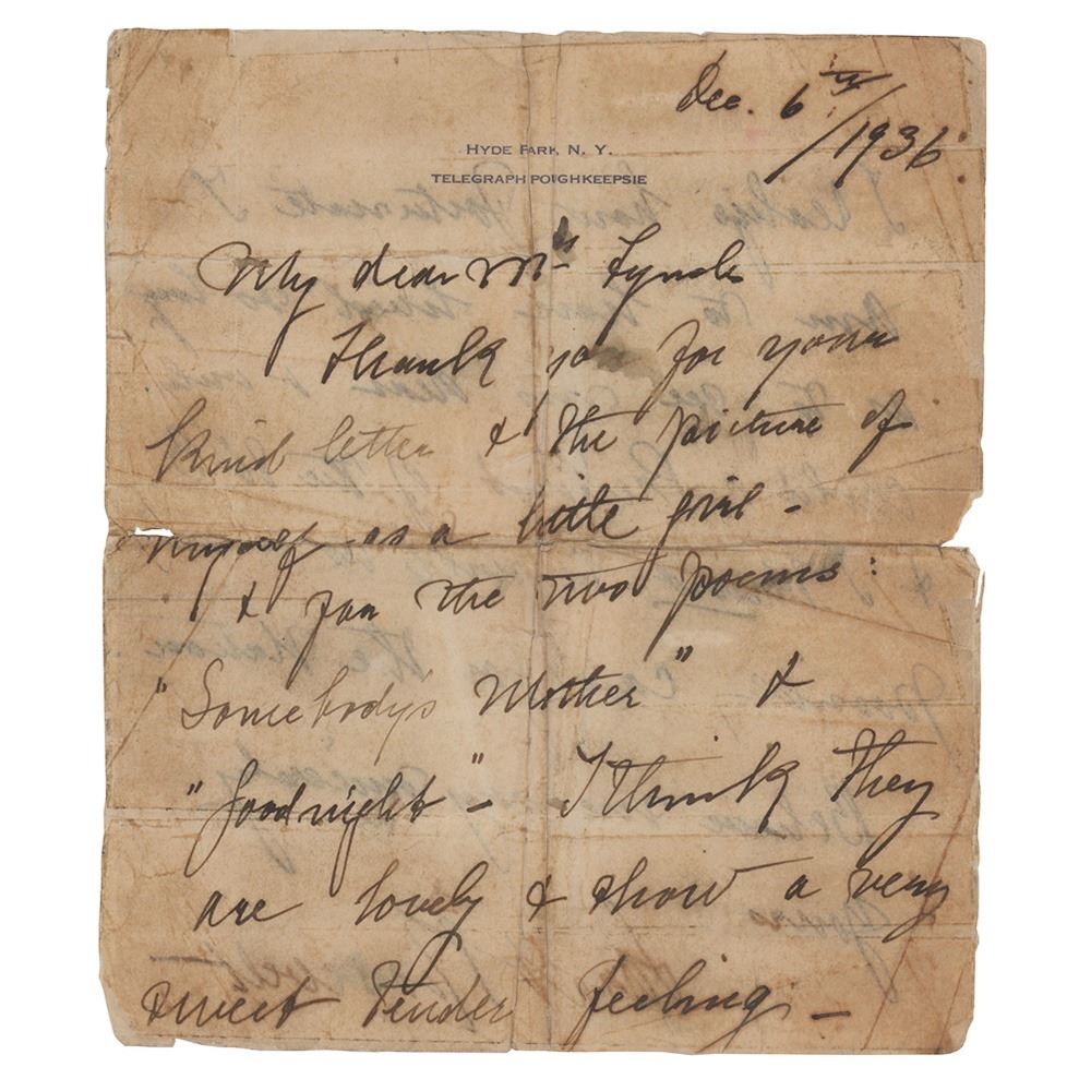 ALS signed “Sara D. Roosevelt,” one page both sides, 5.75 x 6.75, Hyde Park letterhead, December 6, 1936. Handwritten letter to Margaret Irene Lynch, in full: "Thank you for your kind letter & the picture of myself as a little girl—& for the two poems: 'Somebody's Mother' & 'Goodnight.' I think they are lovely & show a very sweet tender feeling. I realize how fortunate I am to have lived so long as to see my dear & only child, President of the U.S. & I know he will do all he possibly can for the Nation." In good to very good condition, with heavy overall creasing and staining. Accompanied by the original hand-addressed mailing envelope.