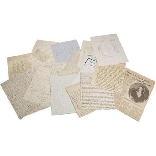 <B>Sara Josepha Hale Archive of Autograph Letters Signed and Personal Correspondence.</B></I> The lifework of Hale, an important American female author and magazine editor, would fill dozens of thick volumes but yet she is best known for authoring a simple nursery rhyme, "Mary Had a Little Lamb" (which, by the way, was inspired by an actual incident). We can also thank Ms. Hale for our annual Thanksgiving holiday. She conducted a letter writing and editorial page campaign for many years to have the last Thursday in November declared a "Day of National Thanksgiving" for the American people; the campaign culminated with a personal letter she wrote to President Lincoln in September 1863 that began "Permit me, as Editress of the "Lady's Book", to request a few minutes of your precious time, while laying before you a subject of deep interest to myself and - as I trust - even to the President of our Republic, of some importance. This subject is to have the day of our annual Thanksgiving made a National and fixed Union Festival." Lincoln decided to take her good advice and, just days later, issued a proclamation that made the fourth Thursday of November Thanksgiving Day. <BR><BR>This lot consists of three ALsS by Hale as follows: <B>1).</B></I> "<I>Sarah Josepha Hale</B></I>", nine pages, 5.5" x 8.5", Philadelphia , January 9, 1865, to Dr. Mason, about fine condition. <B>2).</B></I> "<I>Sarah J. Hale</B></I>", three pages, 8.25" x 11", Philadelphia , January 9, 1865, to Mrs. Mason, about very good condition with some tattering and fold weaknesses. <B>3).</B></I> "<I>Sarah J. Hale</B></I>", eleven pages, 5" x 8", Philadelphia, October 23, 1865, to Dr. James Rush, fine condition.<BR><BR>Also included are approximately 16 letters written to Ms. Hale from various family members, politicians, and literary figures including: Samuel Austin Allibone (author and bibliographer); Charles John Biddle (U.S. congressman and newspaper publisher); John L. Blake (congressman); Maria Mitchell (astronomer); Lydia Sigourney (poet); Emma Willard (women's rights advocate); and Louis A. Godey (editor and publisher). Also included are various newspaper clippings about Ms. Hale. A wonderful group of material from this important 19th century writer and activist.<BR><BR><b>Shipping:</b> Flat Material, Small (<a target="_blank" href="http://www.heritageauctions.com/common/shipping.php">view shipping information</a>)