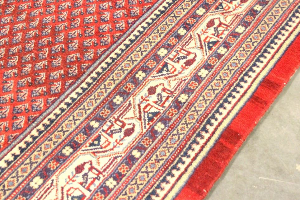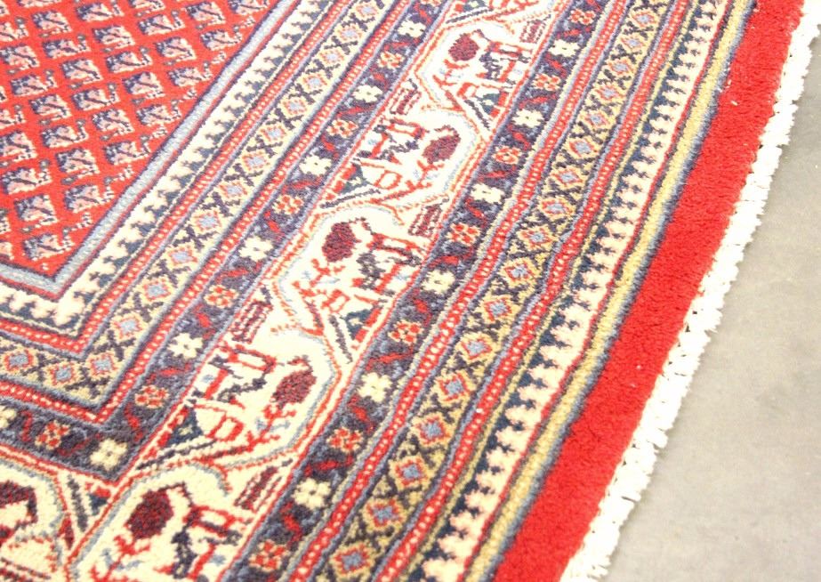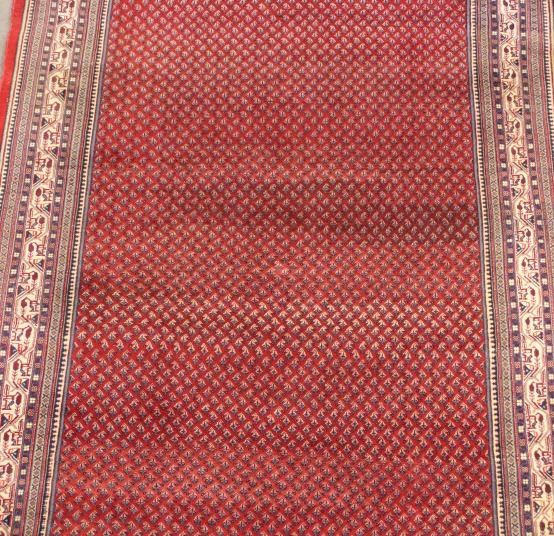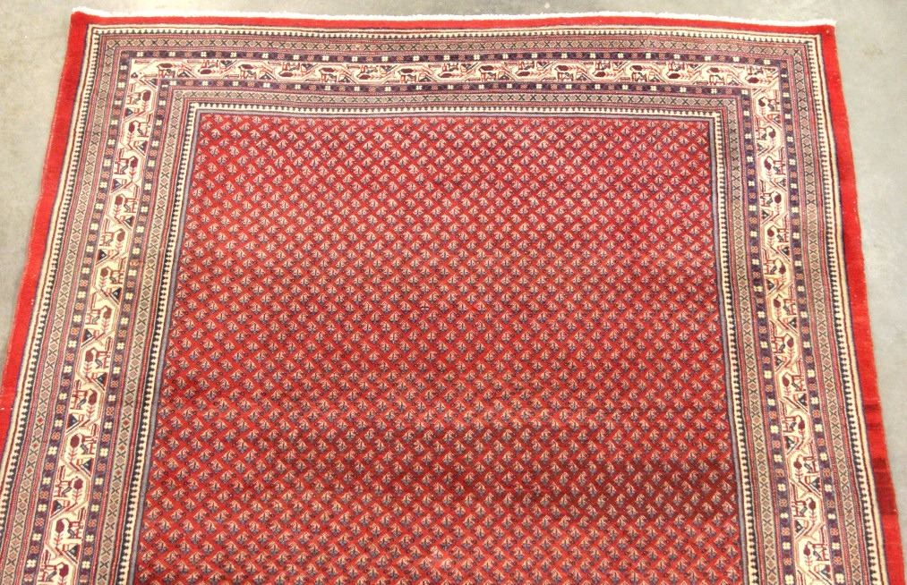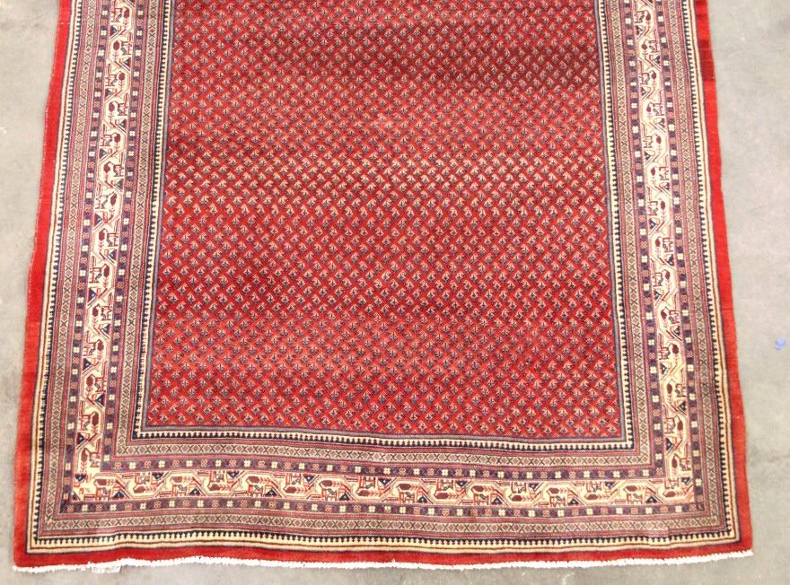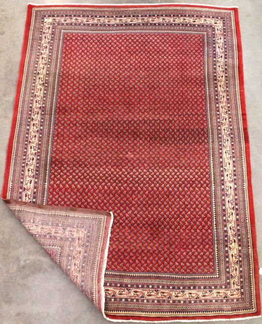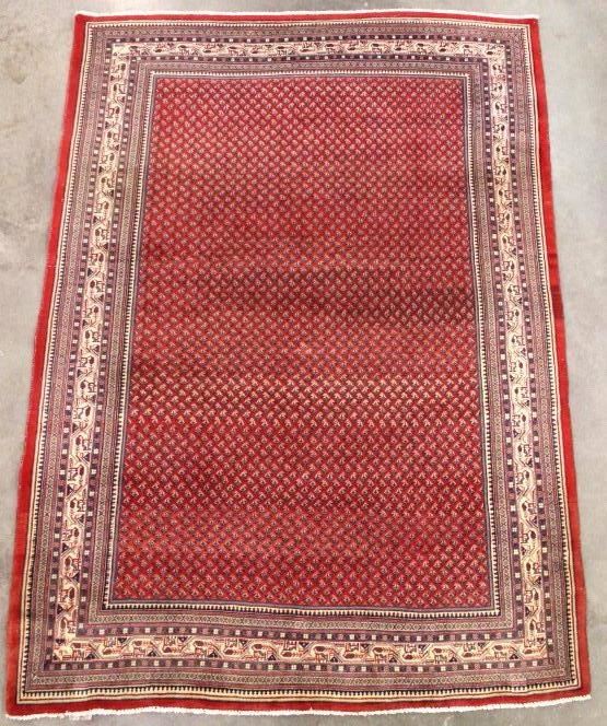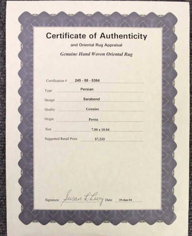 This hand woven Sarabend design Persian rug comes with a certificate of authenticity. It is a ornately design rug that brings a certain warm feel to the room. The weave is tight and it has a leather backing along the edge. It is in good condition for its age. It was previously appraised at $7,233. It measures 84" W x 124" L