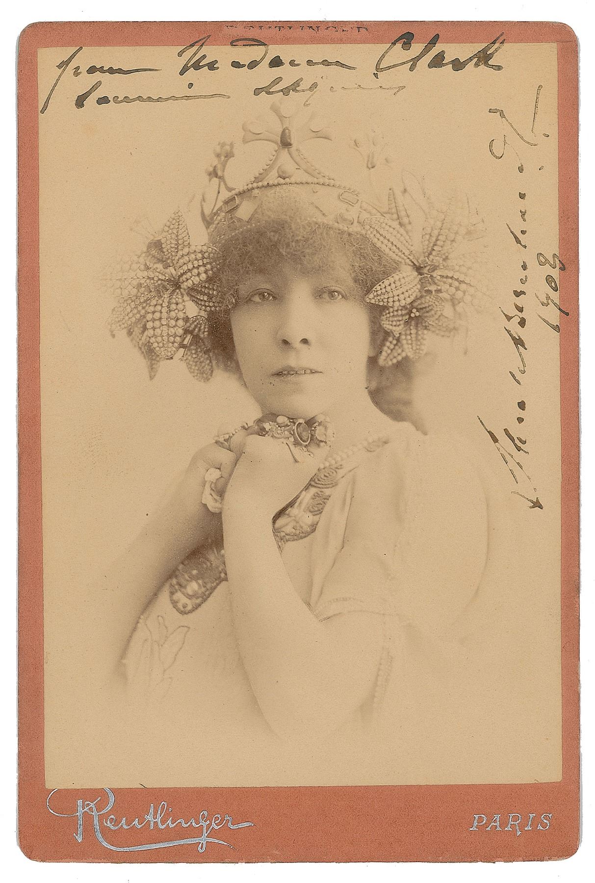 Attractive 4.25 x 6.5 cabinet photo of Bernhardt by Reutlinger of Paris, signed and inscribed in ink, "Pour Madam Clark…Sarah Bernhardt, 1903.” In fine condition, with some ink adhesion trouble to the signature.