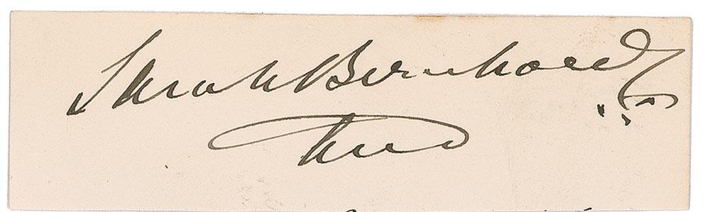 Fountain pen signature, “Sarah Bernhard,” on an off-white 3.5 x 1 card. A small notation is written beneath her signature. In fine condition, with spots of soiling and trimmed edges.