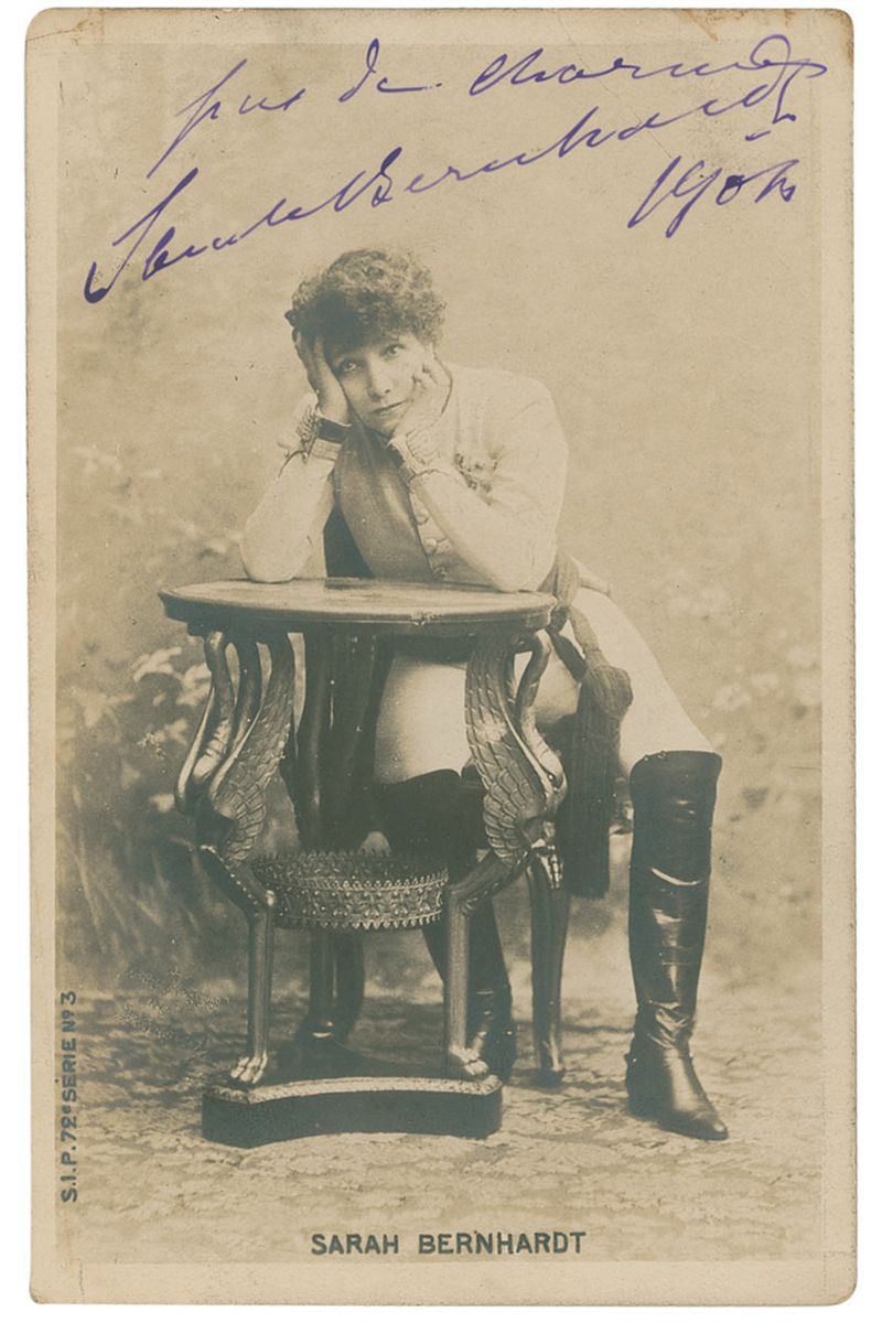 Vintage 3.5 x 5.5 postcard photo of Bernhardt, clad in riding boots, leaning on a small table, signed and inscribed in purple fountain pen. Some light spotting and creasing to top edge, a bit of mild silvering, and adhesive remnants to reverse, otherwise fine condition.