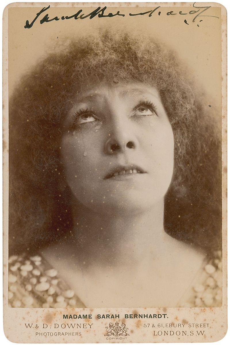 Original 4.25 x 6.5 cabinet photo of Bernhardt looking skyward, by W. & D. Downey of London, signed along the top of the image in fountain pen. In very good condition, with scattered light spotting and silvering to image and toning and foxing to bottom border and reverse.