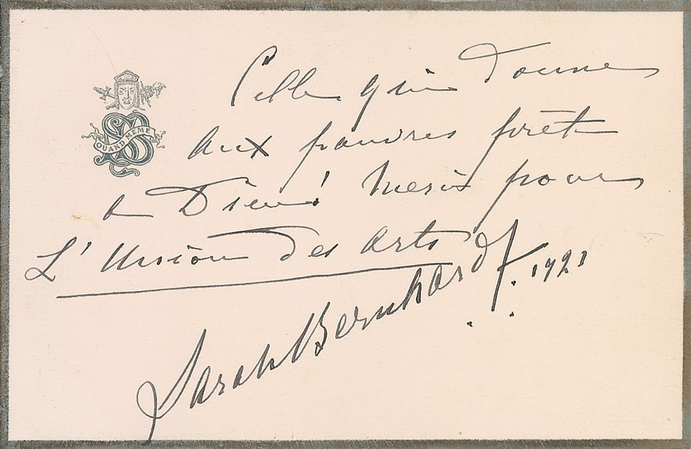 AQS, signed “Sarah Bernhardt 1921,” on an off-white 5.25 x 3.5 black-bordered card. Quote, in French, reads, “The one who gives to the poor lends to God! Thank you for the Union of the Arts.” In fine condition.