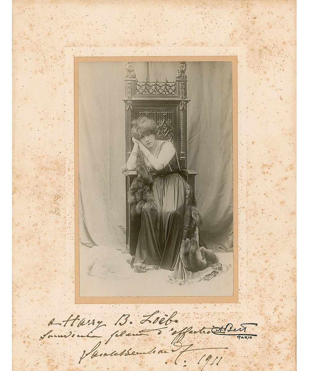 Vintage matte-finish 5.25 x 8 photo of Bernhardt by A. Bert of Paris, affixed to its original 10 x 13 mount, signed and inscribed on the mount in black ink in French, and dated 1911. In very good condition, with heavy overall foxing to mat and slight bleeding to ink.