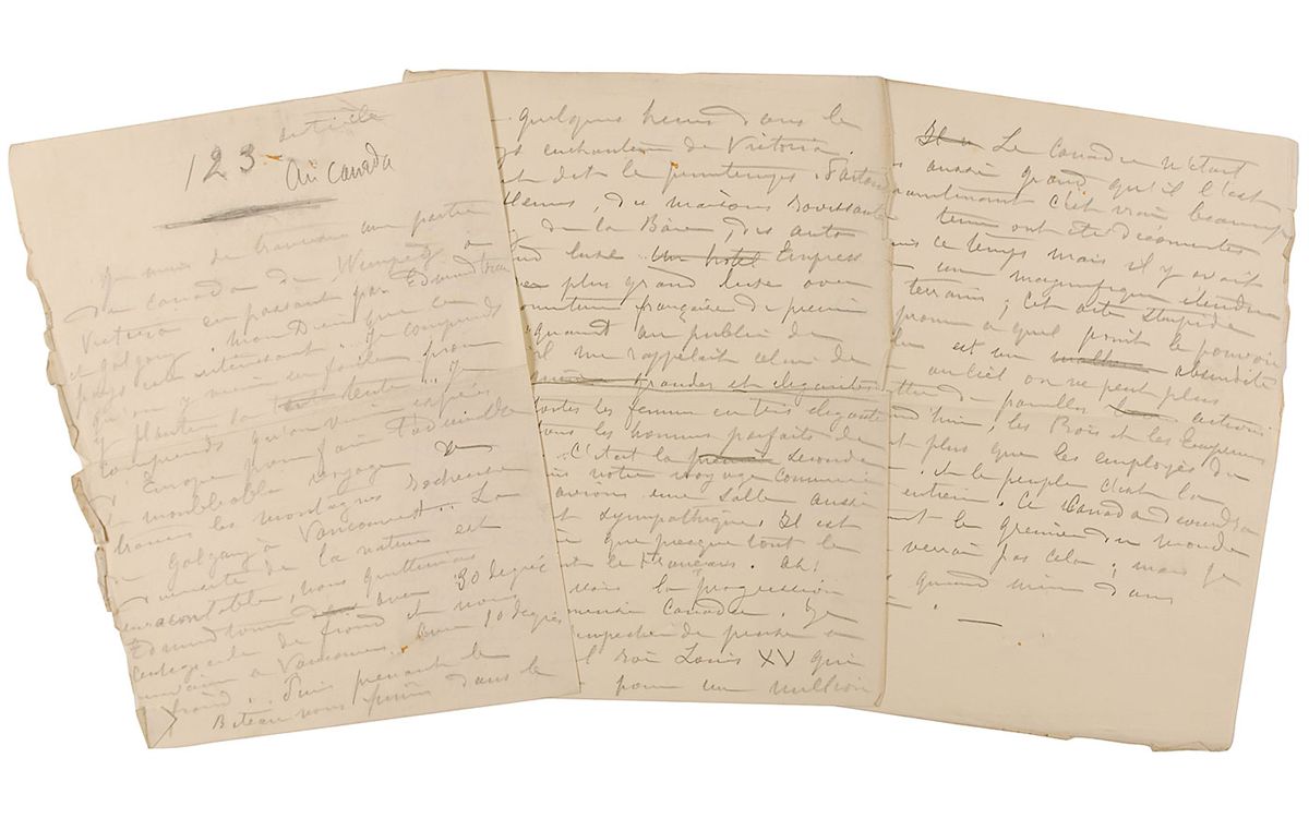 Unsigned handwritten manuscript, in pencil, three pages, 8.25 x 10.75, no date. An article in French entitled “Au Canada,” in part (translated): “I just crossed part of Canada from Winnipeg to Victoria going through Edmonton and Calgary. My God what an interesting country…The diversity of nature cannot be described…It seemed like spring. Flowers everywhere, charming houses along side the bay, very luxurious cars. Oh! when I see the progress of this huge Canada, I cannot help to think about this criminal King Louis XV who sold it for one million…this stupid action proves at what point absolute power is absurd thank God one cannot commit such an act today, the Kings and Emperors are only left to be the employees of the peoples, and the peoples are the whole nation. This Canada will certainly become the world granary attic. I will not live to see that; but nevertheless I see it in the future.” In very good condition, with a central horizontal fold, small chips and tears to the edges, especially affecting writing to left side of first page, light scattered soiling, and rusty staple holes to top and bottom.