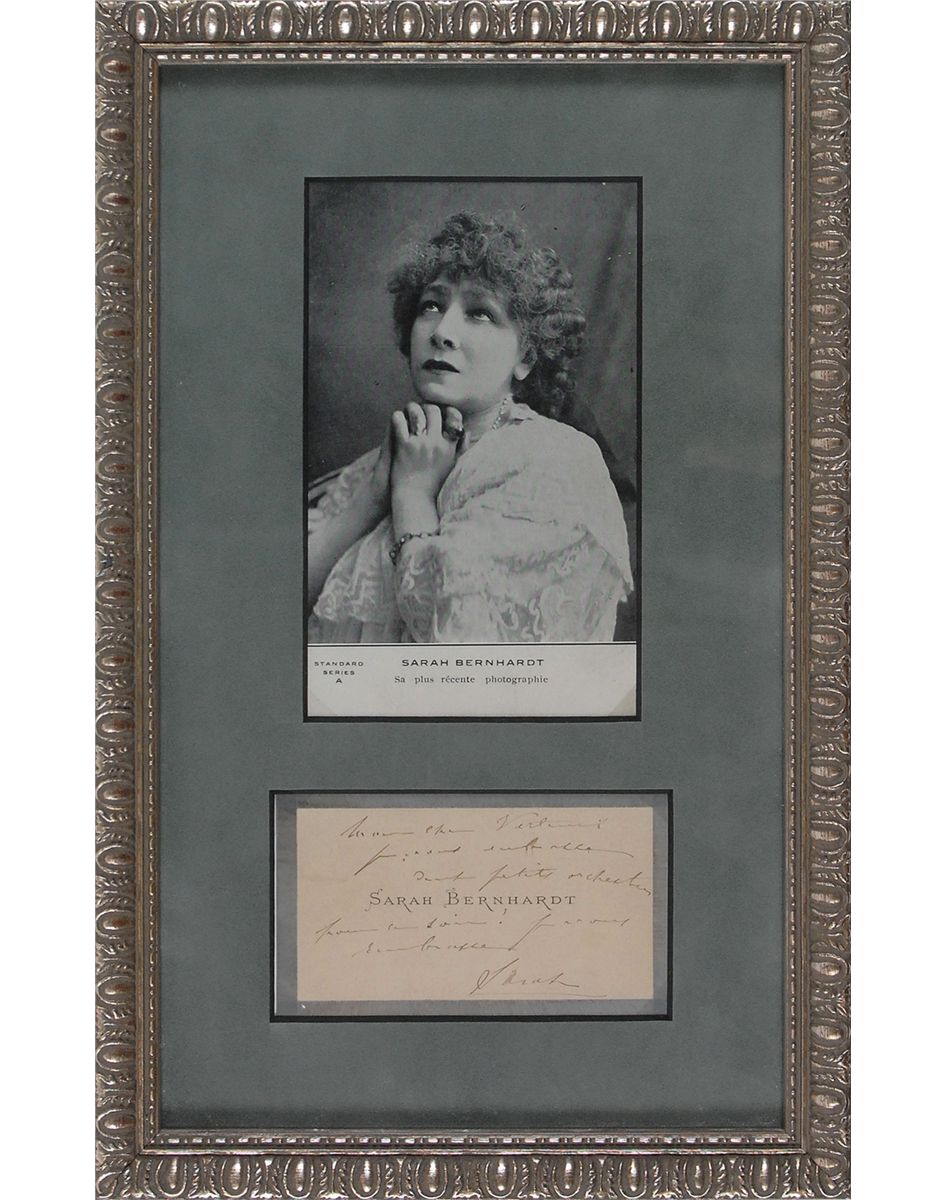 French actress (1844–1923), known as ‘The Divine Sarah,’ who became one of the most revered personalities ever to grace the stage. She was also rumored to be the mistress of Albert Edward, Prince of Wales. ANS in French, signed “Sarah,” on one of her personal 3.25 x 2 calling cards, no date. Brief untranslated note to a friend. Suede-matted and framed with a portrait of Bernhardt to an overall size of 7.25 x 11.5. In fine condition, with a uniform shade of light toning. For more detailed biographical information on Bernhardt please click here.