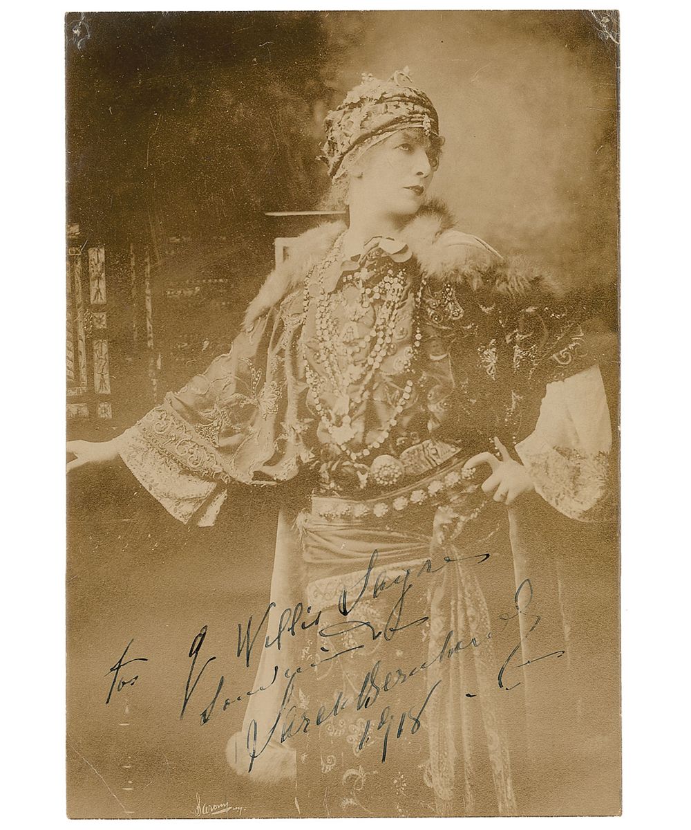 Vintage glossy 6 x 9 photo of Bernhardt dressed in an elaborate outfit, signed and inscribed in black ink, “For J. Willis Sayre, Souvenir de Sarah Bernhardt, 1918.” In fine condition, with various creases to edges and tack holes to corners. Sayre was a notable journalist and arts critic in the Seattle area during the first half of the 20th century.