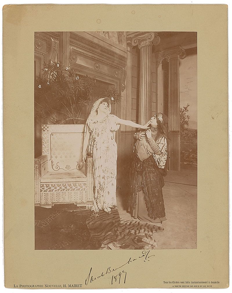 Exceptional 6.75 x 9 photo of Bernhardt acting out one of her roles, affixed to its original 9.25 x 11.75 H. Mairet photographer’s mount, signed on the mount in crisp black ink, “Sarah Bernhardt, 1897.” In fine condition, with subtle scattered stains, a ding to the upper left corner, and slightly trimmed edges to the mount.
