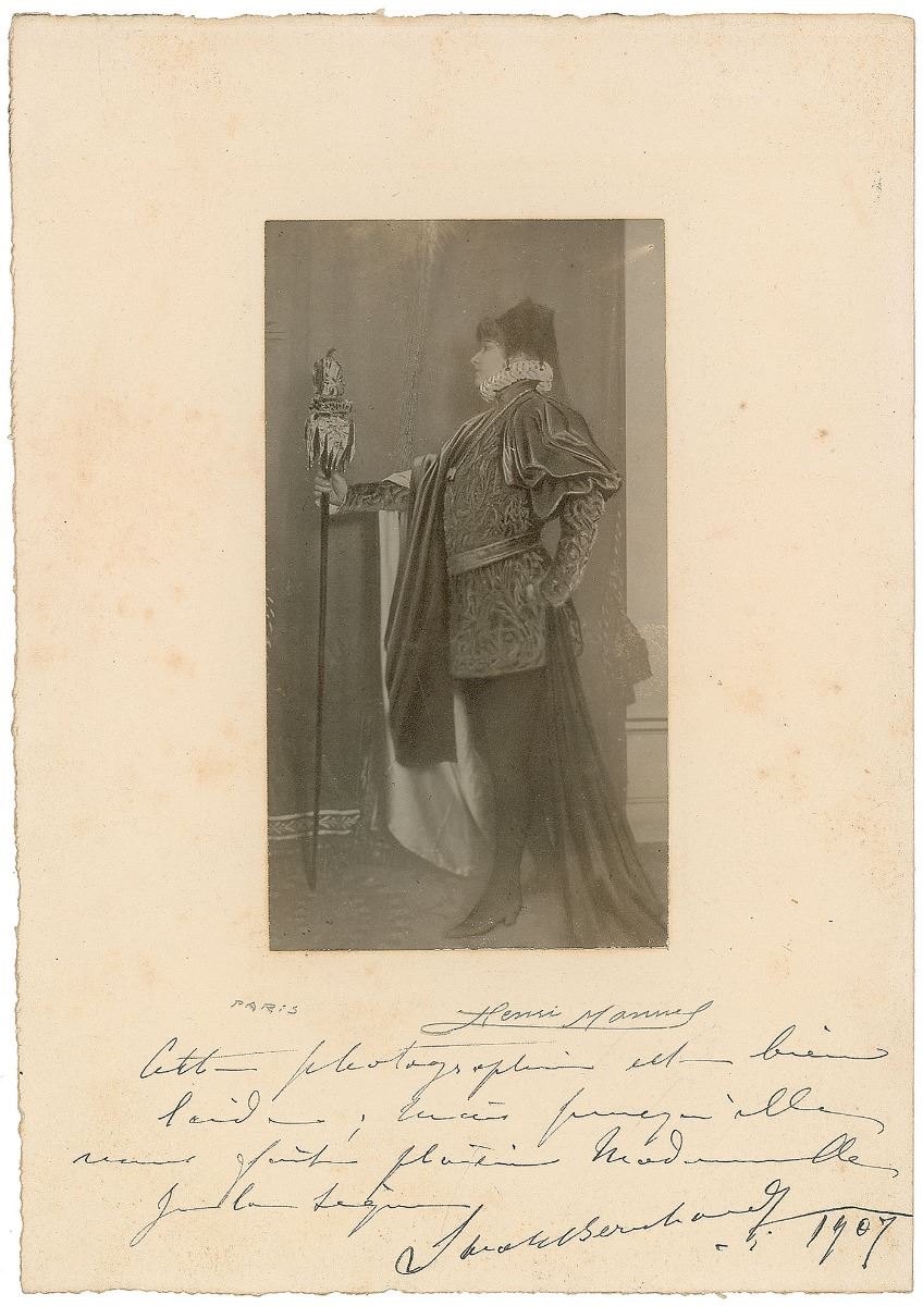 Splendid matte-finish 3.25 x 6 full-length photo of Bernhardt in an elaborate court jester costume, affixed to its original mount, signed and inscribed on the mount in black ink in French, “Sarah Bernhardt, 1907.” In fine condition, with some light foxing to the wide borders.