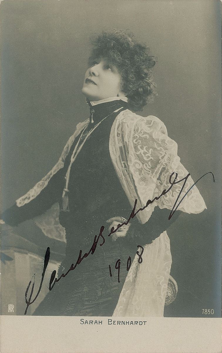 Attractive 3.5 x 5.5 postcard photo of the acclaimed actress, signed in dark ink, “Sarah Bernhardt, 1908.” In fine condition. Accompanied by a full letter of authenticity from PSA/DNA.