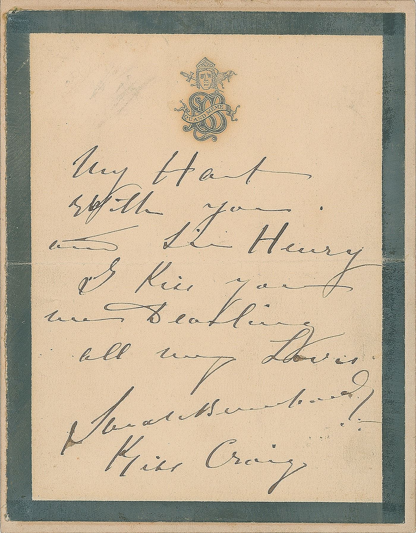 Popular French stage actress of the late 19th and early 20th centuries (1844–1923). ANS, one page, 4 x 5.25, personal monogrammed letterhead, no date. In part: "My heart with you and Sir Henry, I kiss you…all my love." Affixed to a slightly larger card. In fine condition.