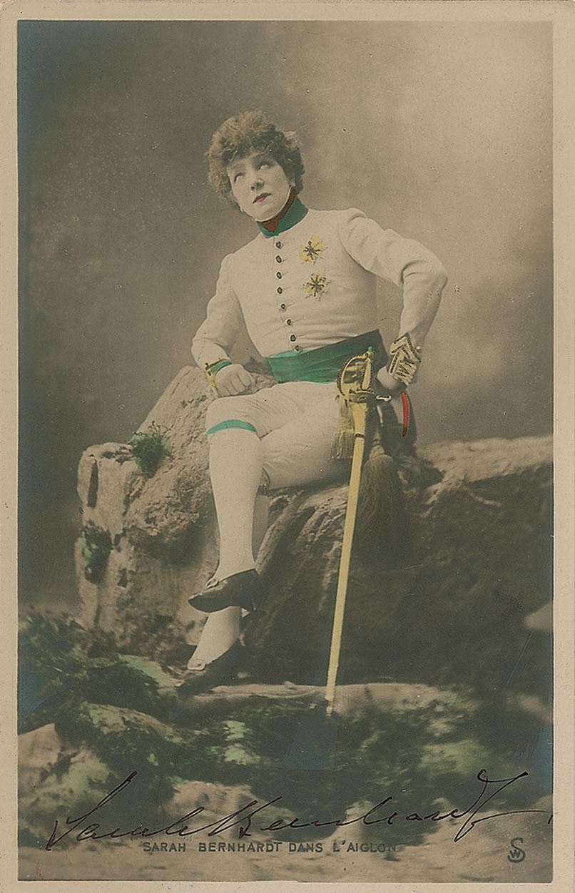 Color-tinted 3.5 x 5.5 postcard photo of Bernhardt in the costume of L’Aiglon, the title character of Edmond Rostand’s play about Napoleon II, neatly signed along the bottom in ink. In fine condition, with poor signature contrast against the rocky background.