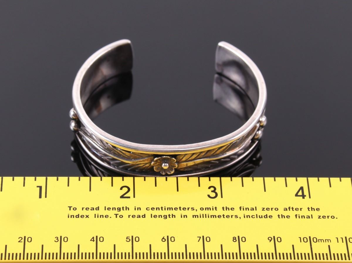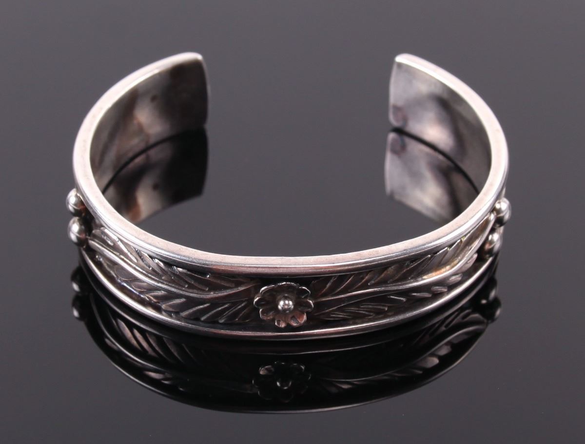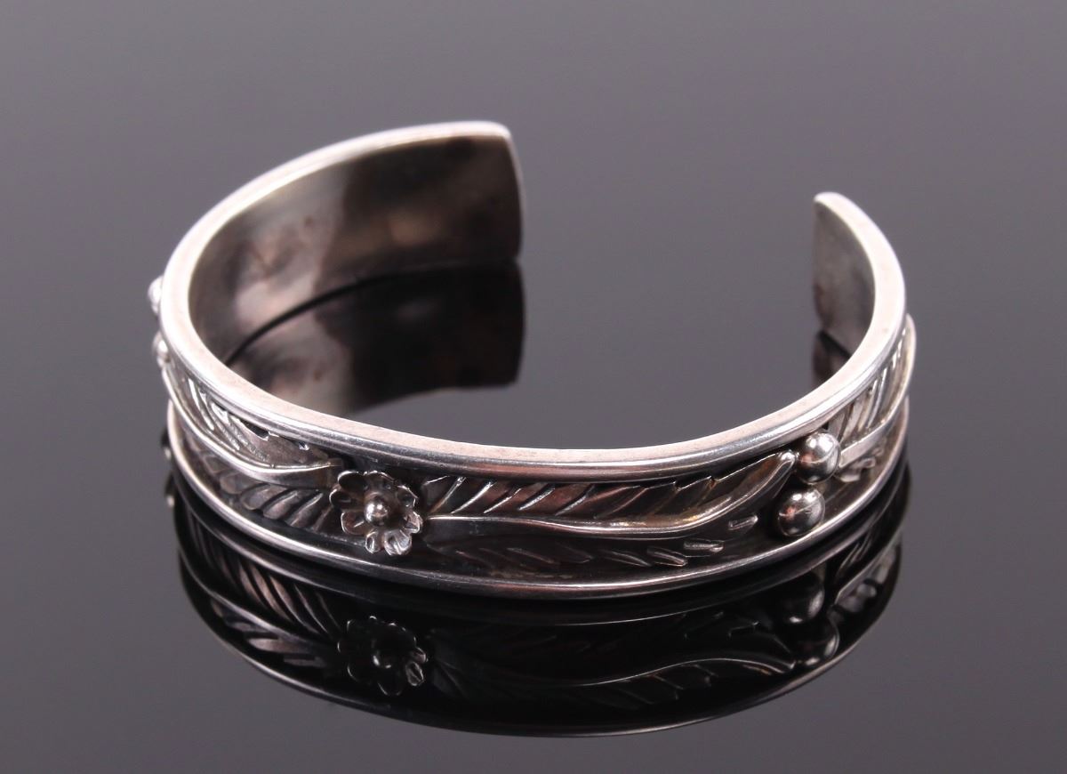 Sarah Chee, Navajo Sterling Silver Cuff Bracelet. Silver Tested. Estimated more than 50 yrs old. The Navajos are a Native American people of the Southwestern United States. After the Cherokee, they are the second largest federally recognized tribe in the United States. Until contact with Pueblos and the Spanish, the Navajos were largely hunters and gatherers. The tribe adopted crop farming techniques from the Pueblo peoples. The practice of spinning and weaving wool into blankets and clothing became common and eventually developed into a form of highly valued artistic expression. Silversmithing is an important art form among Navajos. Atsidi Sani c. 1830–c. 1918 is considered to be the first Navajo silversmith. He learned silversmithing from a Mexican man called Nakai Tsosi "Thin Mexican" around 1878 and began teaching other Navajos how to work with silver. By 1880, Navajo silversmiths were creating handmade jewelry including bracelets, tobacco flasks, necklaces and bracers. Later, they added silver earrings, buckles, bolos, hair ornaments, pins and squash blossom necklaces for tribal use, and to sell to tourists as a way to supplement their income. The Navajos' hallmark jewelry piece called the "squash blossom" necklace first appeared in the 1880s. Turquoise has been part of jewelry for centuries, but Navajo artists did not use inlay techniques to insert turquoise into silver designs until the late 19th century. (Wikipedia) Size: See Ruler Photo. (Photos Represent The Condition Of The Lot.)